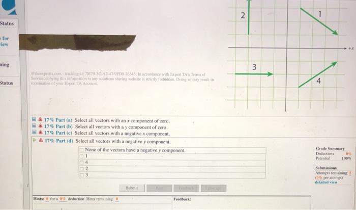 33 Parta Select all cases where the x component of the sum of the vectors is zero. Part a Select all vectors with an x component of zero. Grade Summary Deductions 0 Potential 100 Submissions Attempts remaining.